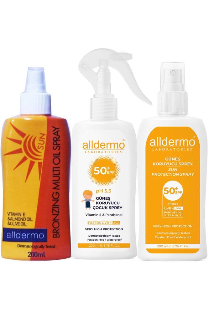 • SET İÇERİĞİ ALLDERMO SPF 50+ 200 ML SPREY ALLDERMO SPF 50+ ÇOCUK 200 ML SPREY ALLDERMO BRONZING MULTI OIL SPREY 200 ML