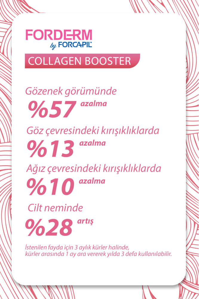 Forderm Collogen Booster Dermise Tip 1 kolajen sağlayanPatentli Peptan® marin kolajeni ve kelp (kahverengi deniz yosunu) içerentakviye edici gıdadır.