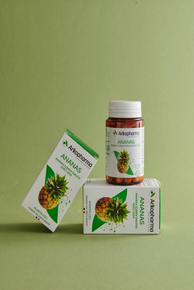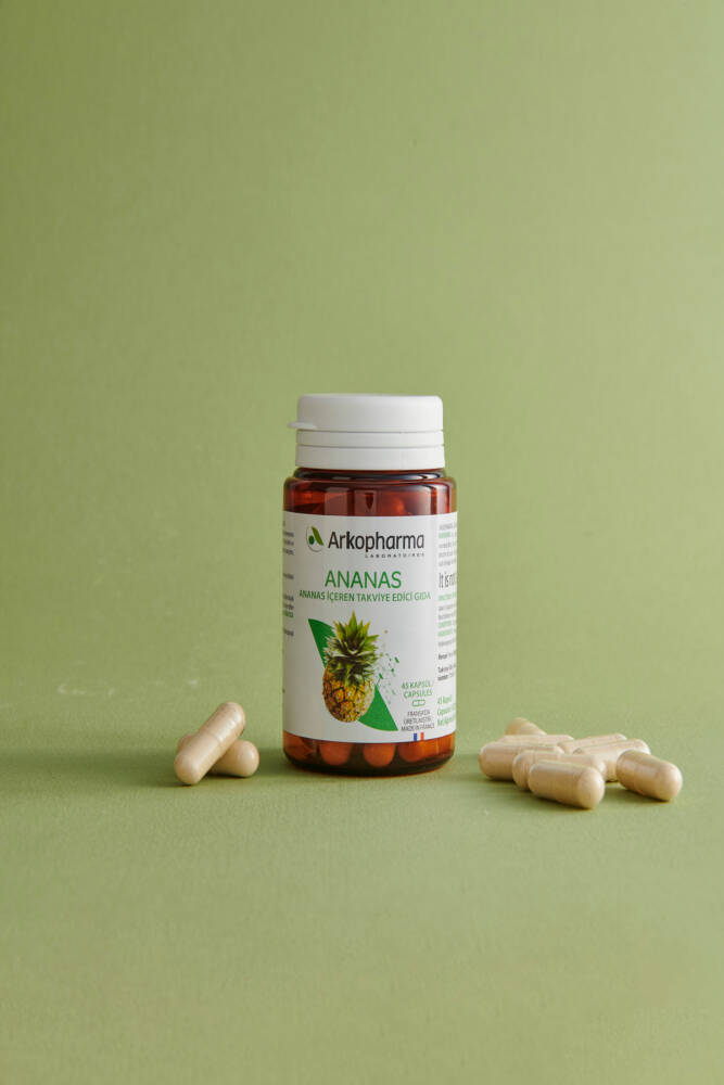 ARKOPHARMA LABORATOIRES Ananas Ananas sapı, (Bromelain , Hidroksipropil metil selüloz (kapsül), Orta zincir trigliseridlerini içerir.; Kullanım Önerisi 18 yaş ve üzeri bireyler için sabah, öğle ve akşam olmak üzere günde 3 kapsül (yemeklerden 20dk önce veya öğün aralarında), büyük bir bardak su ile alınmalıdır. ; Kullanım önerileri Hamile ve emziren kadınlara önerilmez.; Tavsiye edilen günlük dozu aşmayın.; Bir gıda takviyesi, çeşitli ve dengeli bir diyetin ve sağlıklı bir yaşam tarzının yerini almamalıdır.; Küçük çocukların erişebileceği yerlerde bırakmayın.; Işıktan, ısıdan ve nemden uzakta saklayın.; İçerik Ananas Comosus – Ananas Ekstresi 975 mg Ambalaj İçeriği: 45 kapsül / 18 g Menşei: Fransa