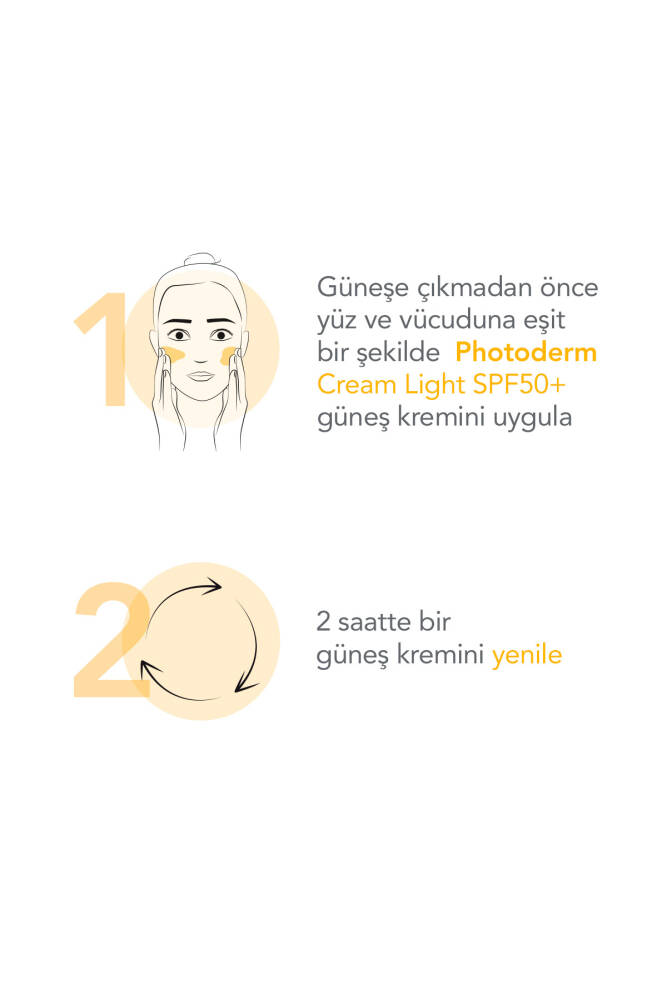 • Ürün Tanımı: Photoderm Cream SPF50+ Light 40 ml Kuru ve çok kuru ciltler için çok yüksek koruma sağlayan renkli güneş koruyucu Yüksek teknolojili Sun Active Defense™M* patenti UVA ışınlarına karşı güçlendirilmiş içeriği ve UVB ışınlarına karşı etkili performansı ile güneşe karşı %99,8 DNA koruması** sağlar. Benzersiz UV filtreleri ve patentli biyolojik koruma ile güneşe karşı cildin kendini savunma mekanizmasını güçlendirir ve cildin erken yaşlanmasının önlenmesine destek olur. Krem dokusu ile cildi derinlemesine nemlendirir. Beyaz iz ve yağlı bir tabaka bırakmaz. Renkli dokusu sayesinde cilt tonunu eşitler. Mükemmel bir makyaj bazıdır. Çok yüksek cilt ve göz çevresi toleransı sağlar. Dermatolojik ve oftalmolojik olarak test edilmiştir. Deniz canlılarını koruyarak su ekosistemine zarar vermez.*** Fotostabildir. Parfüm ve paraben içermez. Ürün Kullanım Önerileri: Kullanmadan önce kutuyu iyice çalkalayınız. Güneşe çıkmadan önce yüz bölgesine bolca ve eşit bir şekilde uygulayınız. 2 saatte bir ve özellikle yüzme, terleme ve havluyla kurulama sonrası tekrar uygulanmalıdır. Gözlere direkt temas ettirilmemelidir. Ürün İçeriği: AQUA/WATER/EAU, DIETHYLAMINO HYDROXYBENZOYL HEXYL BENZOATE, HOMOSALATE, DIISOPROPYL SEBACATE, BIS-ETHYLHEXYLOXYPHENOL METHOXYPHENYL TRIAZINE, DIBUTYL ADIPATE, PROPANEDIOL, ETHYLHEXYL SALICYLATE, ETHYLHEXYL TRIAZONE, SILICA, GLYCERIN, TITANIUM DIOXIDE (CI 77891), PROPYLENE GLYCOL, SUCROSE STEARATE, GLYCERYL STEARATE, PEG-100 STEARATE, IRON OXIDES (CI 77492), PENTYLENE GLYCOL, 1,2-HEXANEDIOL, SODIUM CITRATE, XANTHAN GUM, IRON OXIDES (CI 77491), CAPRYLYL GLYCOL, POLYACRYLATE CROSSPOLYMER-6, CITRIC ACID, IRON OXIDES (CI 77499), ECTOIN, MANNITOL, XYLITOL, RHAMNOSE, FRUCTOOLIGOSACCHARIDES, CAPRYLIC/CAPRIC TRIGLYCERIDE, LAMINARIA OCHROLEUCA EXTRACT. [BI 544]