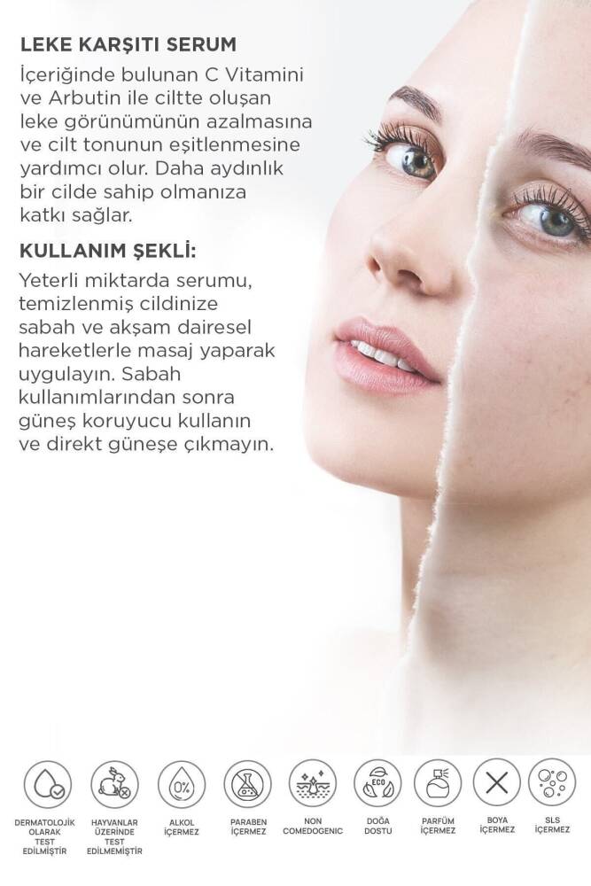 • Derminix Leke Karşıtı Serum, ciltteki lekelerin görünümünü azaltmaya yardımcı olmak için güçlü bir bileşen olan aktif C vitamini ile zenginleştirilmiştir