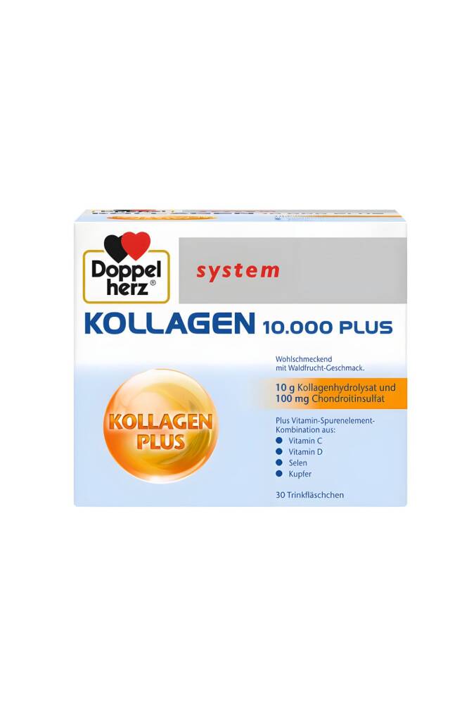 Doppelherz System Kollagen 10.000 Plus, her flakonda 10 g kolajen hidrolizat ile kondroitin sülfat, Vitamin C, Vitamin D, bakır ve selenyum içeren, içime hazır sıvı formdadır. Orman meyvesi aromasıyla günlük rutine kolayca uyum sağlar.
