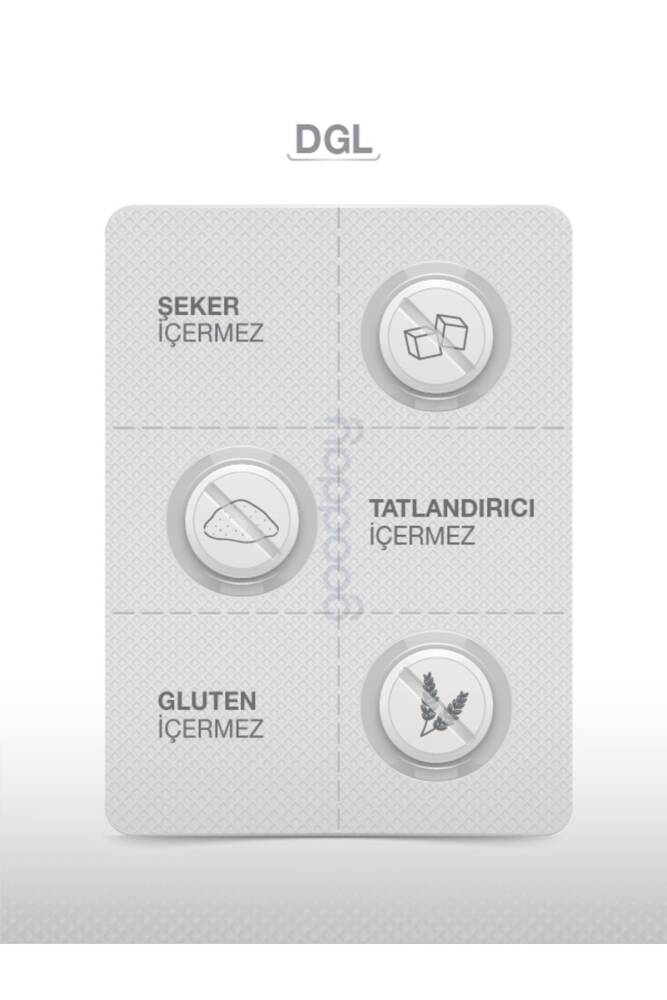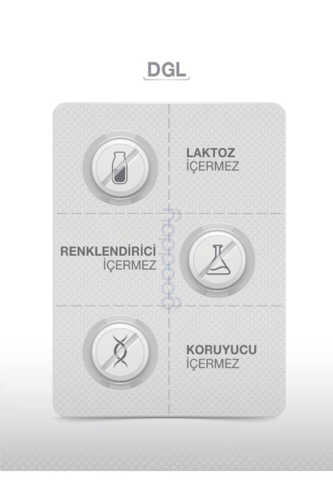 • DGL Meyan Kökü, Hatmi Çiçeği, Karaağaç Kabuğu İçeren Çiğneme Tableti Takviye Edici Gıda Net miktar: 120 çiğneme tablet Kullanım Bilgisi: Tavsiye edilen günlük porsiyon miktarı yetişkinlerde sabah 2 tablet akşam 2 tablet olmak üzere günde 4 tablet kullanılması önerilir.