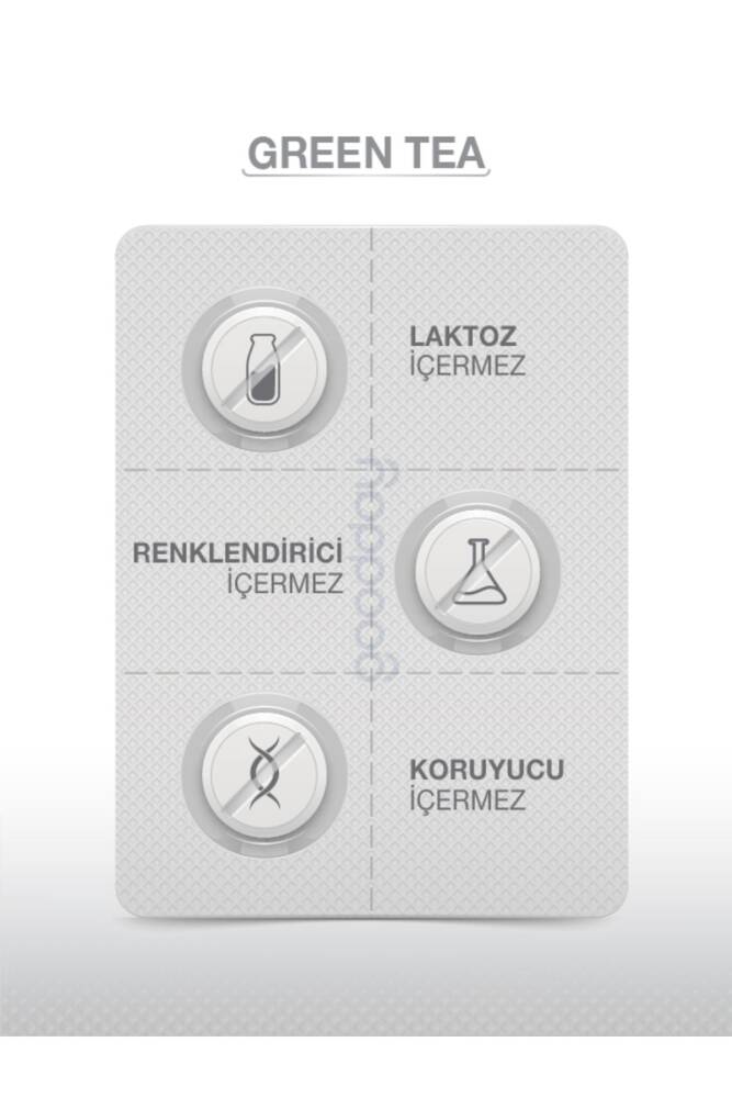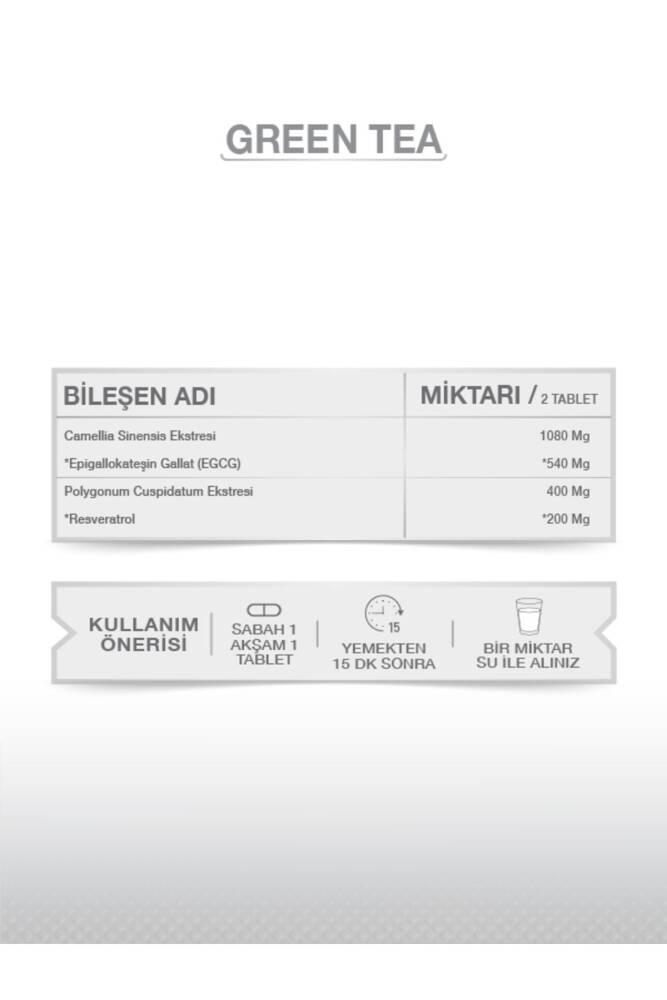 • GREENTEA + RESVERATROL Yeşil Çay Ekstresi, Resveratrol İçeren Takviye Edici Gıda Kullanım Bilgisi: Tavsiye edilen günlük porsiyon miktarı yemeklerden sonra yetişkinlerde sabah 1 tablet, akşam 1 tablet olmak üzere günde 2 tablet kullanılması önerilir. Net Miktarı: 60 Tablet BİLEŞEN ADI Kafeinsiz Yeşil Çay Ekstresi %50 EGCG içeriği ve %50 Resveratrol