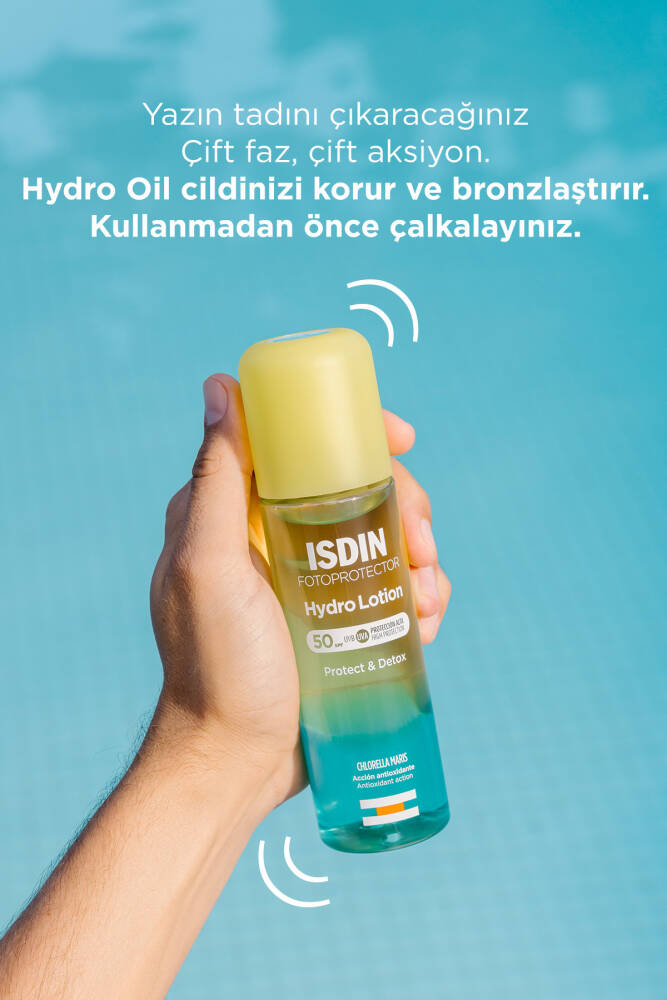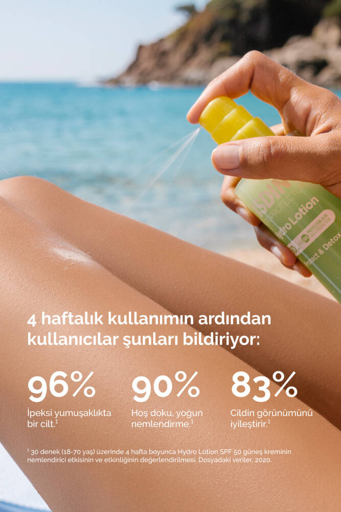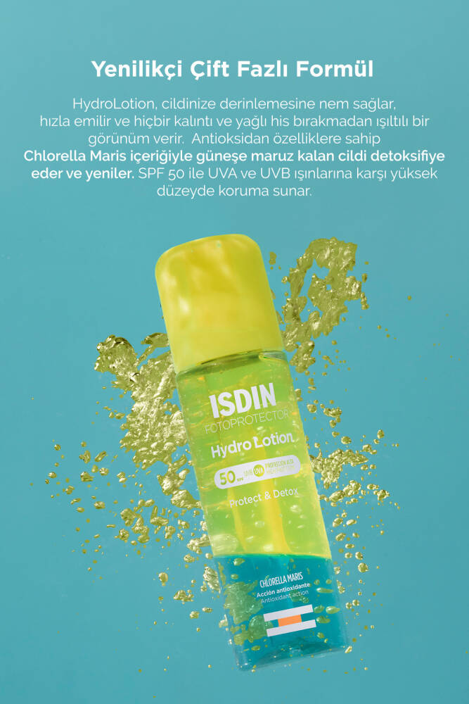 HydroLotion, yenilikçi çift fazlı formülüyle cildinize derinlemesine nem sağlar, hızla emilir ve hiçbir kalıntı bırakmaz. Antioksidan özelliklere sahip Chlorella Maris içeriğiyle güneşe maruz kalan cildi detoksifiye eder ve yeniler. SPF 50 ile UVA ve UVB ışınlarına karşı yüksek düzeyde koruma sunar. Güneşin zararlı etkilerine karşı etkili bir kalkan oluştururken, cildinizin doğal nem dengesini korur ve taze, ferah bir his bırakır.