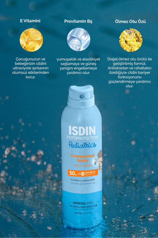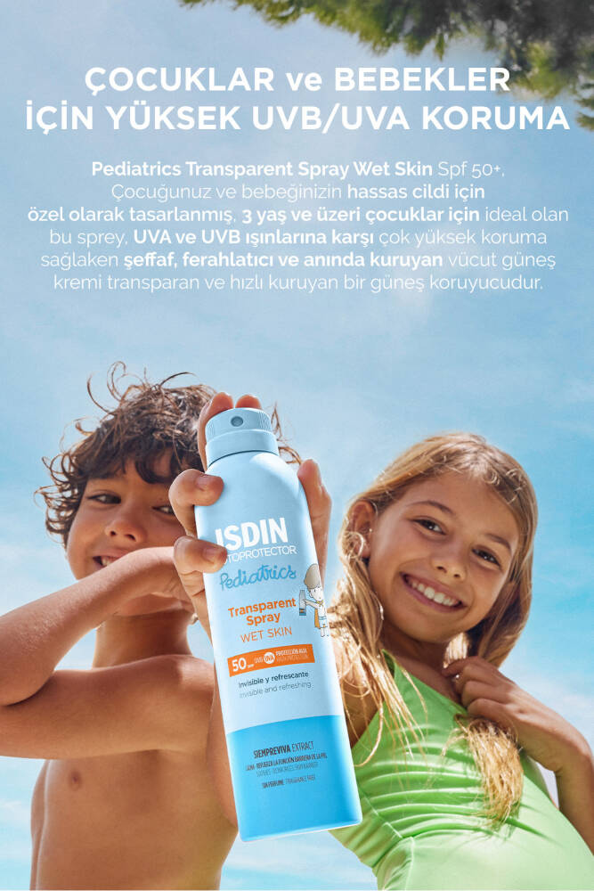 ISDIN Fotoprotector Transparent Spray Wet Skin Pediatrics SPF 50, çocukların hassas cildi için özel olarak tasarlanmış, transparan ve hızlı kuruyan bir güneş koruyucudur. 3 yaş ve üzeri çocuklar için ideal olan bu sprey, SPF 50 ile UVA ve UVB ışınlarına karşı çok yüksek koruma sağlar. Günlük kullanıma uygun yapısıyla cildi güneşin zararlı etkilerine, güneş yanıklarına ve foto yaşlanmaya karşı etkin bir şekilde korur.