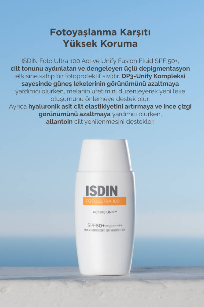 ISDIN Foto Ultra 100 Active Unify Fusion Fluid SPF 50+, cilt tonunu aydınlatan ve dengeleyen üçlü depigmentasyon etkisine sahip bir fotoprotektif sıvıdır. DP3-Unify Kompleksi sayesinde güneş lekelerinin azalmasına yardımcı olur ve melanin üretimini düzenler. SPF 100 koruma faktörü, SPF 50+'ye göre UVA korumasını 2 kat daha fazla sunarak, yeni lekelerin oluşumunu engeller. Çünkü UVA ışınları, pigmentasyonun ana tetikleyicisidir. . Allantoin ise cilt yenilenmesini destekler. Ultra hafif Fusion Fluid dokusu, hızla emilir ve ciltle mükemmel uyum sağlar. Suya dayanıklı formülüyle uzun süreli koruma sunar. Yağsız, komedojenik olmayan ve hipoalerjenik formülü, hassas ve atopik ciltler için uygundur. Dermatolojik olarak test edilmiştir.