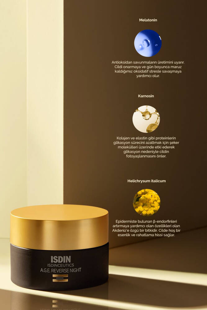 ISDIN A.G.E. Reverse Night Cream 50g, içeriğindeki Melatonin ile gece boyunca cildin antioksidan savunmalarını uyararak gün boyunca maruz kaldığı zararlara karşı koruma sağlar. Ayrıca, Carnosine sayesinde ileri derecedeki glikasyon ürünlerinin (AGE) oluşumunu geciktirir, bu da kollajen ve elastinin düzgün işlevini destekler. Helichrysum Italicum ekstresi ise cildin rahatlatıcı moleküller salınımını artırarak cildin iyileşme sürecine yardımcı olur. Bu etkili gece kremi, cildin elastikiyetini artırarak yaşlanma belirtilerine karşı mücadele eder ve cildin doğal dengesini yeniden sağlar.