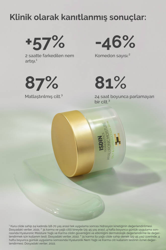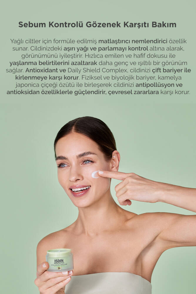 ISDINCEUTICS Hyaluronic Moisture kremi, kombin ve yağlı ciltler için formüle edilmiş matlaştırıcı nemlendirici özellik sunar. Cildinizdeki aşırı yağı ve parlamayı kontrol altına alarak, görünümünü iyileştirir. Hızlıca emilen ve hafif dokusu ile cilt tarafından kolayca kabul edilen bu krem, cildinizi derinlemesine nemlendirir ve yaşlanma belirtilerini azaltarak daha genç ve ışıltılı bir görünüm sağlar.