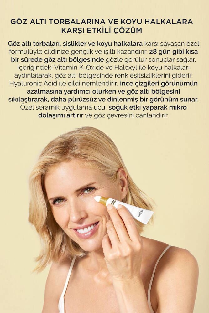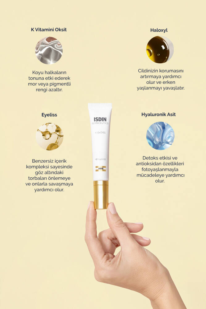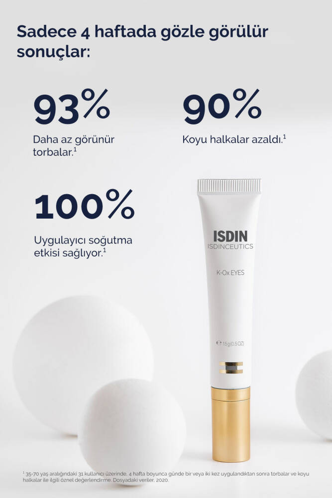 Isdinceutics'in K-Ox Eyes göz kremi, göz altı torbaları, şişlikler ve koyu halkalara karşı savaşan özel formülüyle cildinize gençlik ve ışıltı kazandırır. 28 gün gibi kısa bir sürede göz altı bölgesinde gözle görülür sonuçlar sağlar. İçeriğindeki Vitamin K-Oxide ve Haloxyl ile koyu halkaları aydınlatarak, göz altı bölgesinde renk eşitsizliklerini giderir. Eyeliss aktif bileşeni, şişlikleri ve göz altı torbalarını azaltarak, göz çevresinin daha dinlenmiş ve genç görünmesini sağlar.