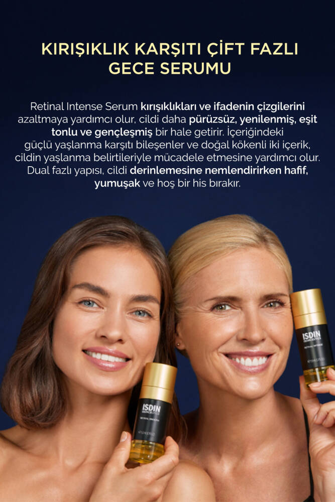 ISDIN ISDINCEUTICS Retinal Intense Serum 50 ml , tüm cilt tipleri için formüle edilmiş güçlü bir gece serumudur. Bu biphasic (çift fazlı) serum, kırışıklıkları ve ifadenin çizgilerini azaltmaya yardımcı olur, cildi daha pürüzsüz, yenilenmiş, eşit tonlu ve gençleşmiş bir hale getirir.