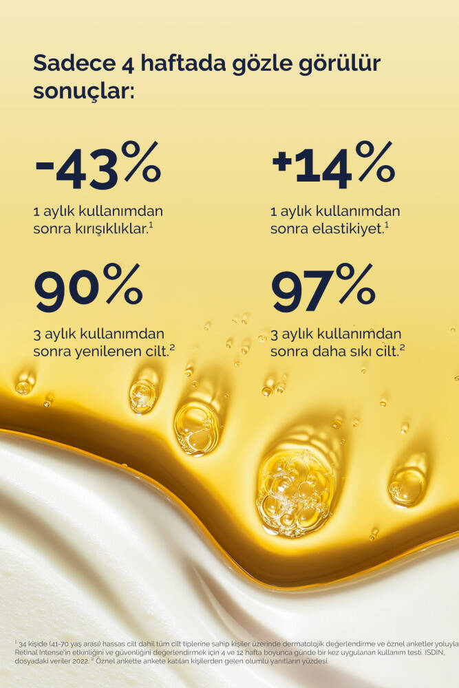 Retinal Intense gece serumunu düzenli kullanarak cildinizin yenilenmesini hızlandırabilir, 1 aylık kullanım sonrasında kırışıklıkların ve ince çizgilerin %43 oranında azaldığını görebilir, daha pürüzsüz, eşit tonlu ve gençleşmiş bir cilde kavuşabilirsiniz.
