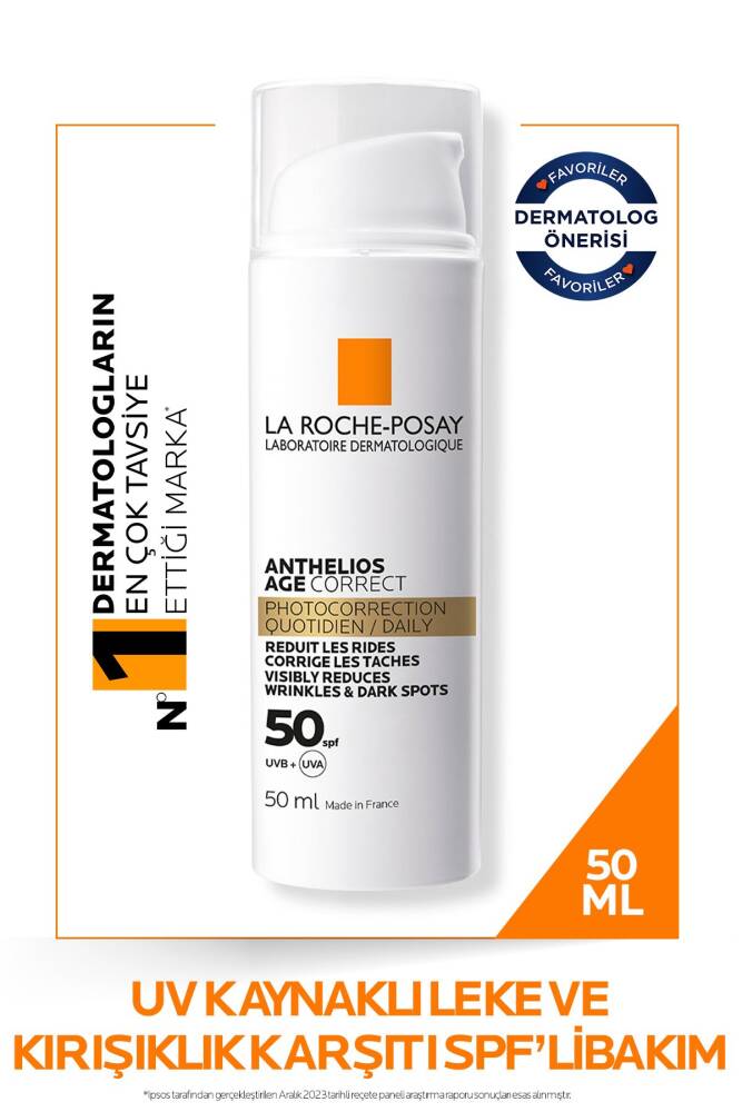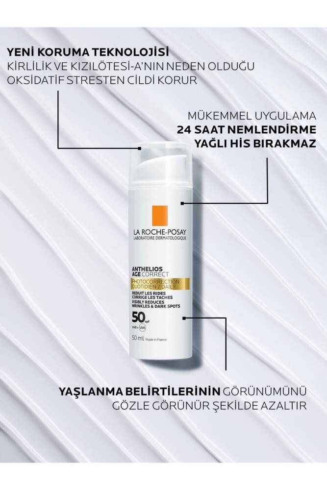 Anthelios Age Correct SPF50, geniş spektrum UVA/UVB koruma sağlarken, Hyalüronik Asit, PHE-Resorsinol (feniletil resorsinol), LHA (Capryloyl Salicylic Acid) ve Niasinamid içeren formülüyle kırışıklık ve koyu leke görünümünü hedefler; esneklik hissini artırmaya yardımcı olur. Hassas ciltler için uygundur; anti-kirlilik ve anti-oksidasyon yaklaşımıyla günlük şehir yaşantısına da uyum sağlar.