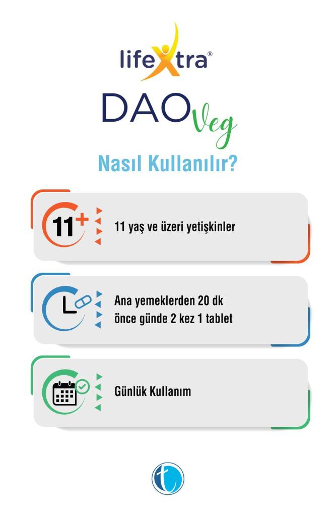 • Etken Maddeler Miktar (1 Tablet) Bezelye (Pisum sativum L.) Filizi 4,2 mg Diamin oksidaz (DAO)* 0,3 mg * Bezelye Filizi kurutulmus tozundan gelen DAO Yerli Üretim cGMP Tavsiye Edilen Günlük Alım Dozu: 11 yaş ve üzeri yetişkinler için, günde 2 kez 1’er tablet olmak üzere, yemeklerden 20 dakika önce bir bardak su ile tüketilmesi tavsiye edilir.