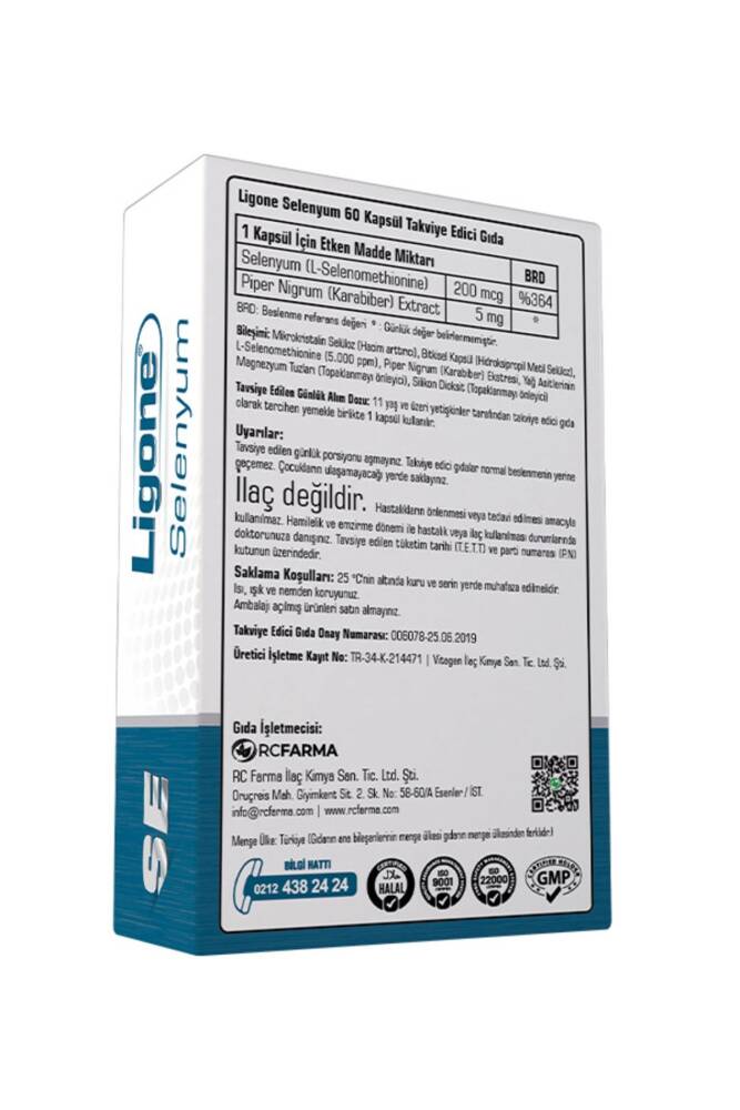 Ligone Selenyum; bitkisel kaynaklı L-Selenometiyonin ve %95 piperin standardizasyonuna sahip karabiber ekstresi (Bioperine®) içeren, Vcaps® bitkisel kapsüllerle sunulan bir takviyedir. Renklendirici içermez ve vegan/vejetaryen kullanıma uygundur.