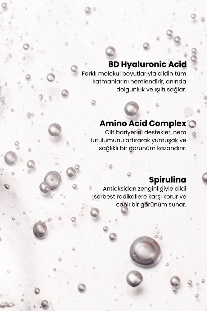 8D Hyaluronik Asit • Spirulina • Amino Asit Kompleksi • Centella Asiatica • Vegan • Alkol/Boya/Parfüm/Sülfat içermez • Dermatolojik olarak test edilmiştir