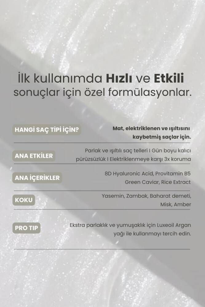8D Hyaluronik Asit Kompleksi • Provitamin B5 • Yüksek parlaklık • Elektriklenme kontrolü • Ağırlık yapmayan jel doku