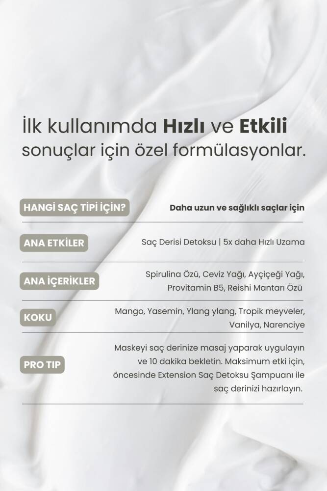 Saç derisini besleyerek saç köklerini güçlendirmeye yardımcı olan bu özel maske, yavaş uzayan saçları hedef alır. At Kuyruğu (Equisetum) Özü, Kolajen ve Biotin ile saç köklerini destekler; arındırıcı ve dengeleyici formülü fazla yağı kontrol altına alarak sağlıklı bir büyüme ortamı sağlar. Spirulina, Panthenol ve bitkisel yağlar ile nemlendirir, kırılmaları azaltmaya ve daha dolgun bir görünüm kazandırmaya yardımcı olur. Günlük rutinin tamamlayıcısı olarak Extension şampuanla birlikte düzenli kullanım önerilir.