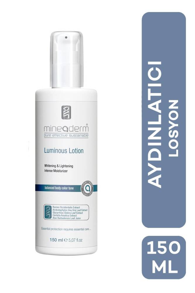 • Aydınlatıcı Losyon Luminous Lotion SERİ ADI Vücut Bakım Serisi ÜRÜN TİPİ Krem CİLT TİPİ Tüm Cilt Tipleri CİLT İHTİYACI Aydınlatıma Luminous Lotion, güçlü içeriği sayesinde yoğun beyazlık ve ışıltı kazandıran aktif içerikleri ile cildin renk dengesinin ve homojen görünümünün sağlanmasını ve canlı görünümünü destekler. Cilt tonunun düzenlenmesine, homojen ve aydınlık görünmesine yardımcı olur. Hassas içeriklerle formüle edilmiştir, pH dengesi cilt yapısına uygundur. Kozmetik Etki · Cilt tonunun düzenlenmesine yardımcı olur · Cildin aydınlık görünmesini destekler · Cildin renk dengesinin sağlanmasını destekler. · Cildin homojen görünmesine yardımcı olur. Kullanım ve Uyarılar: İnce bir tabaka halinde, özellikle vücut bölgesinde, ürün tamamen emilinceye kadar, hassas masaj yaparak uygulayınız. Günde bir kez ve düzenli kulanınız. / Bilek içerisinde (patch) test edip kullanınız. Göz ile temas ettirmeyiniz