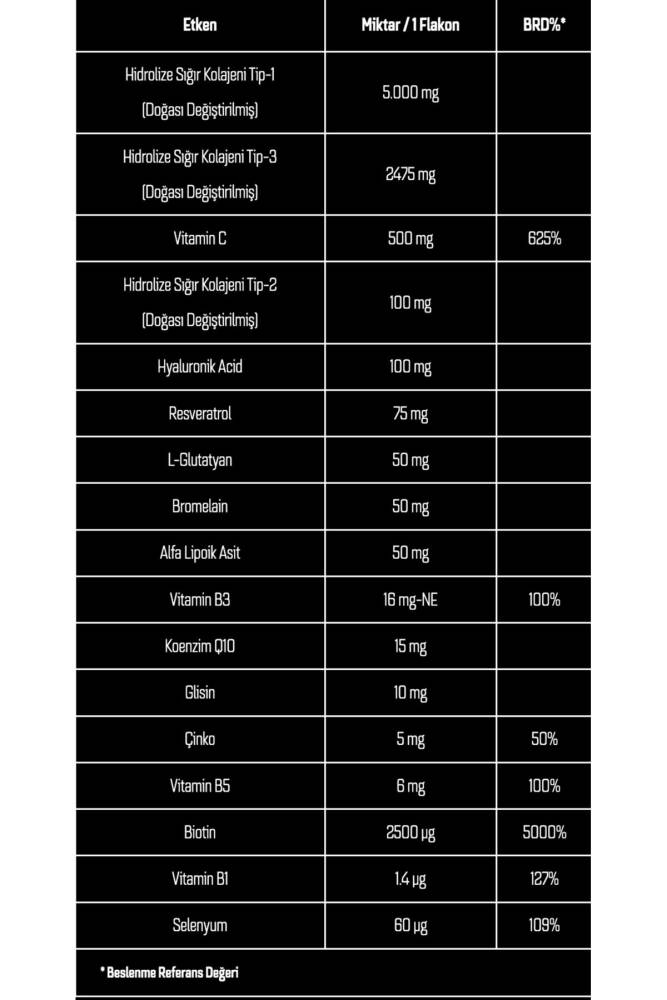- Hidrolize Sığır Kolajeni Tip-1 (Doğası Değiştirilmiş):Kemik, deri ve tendonlar gibi bağ dokularının sağlığını destekler. Cilt elastikiyetini ve sıkılığını artırır, yaşlanma belirtilerini azaltır.