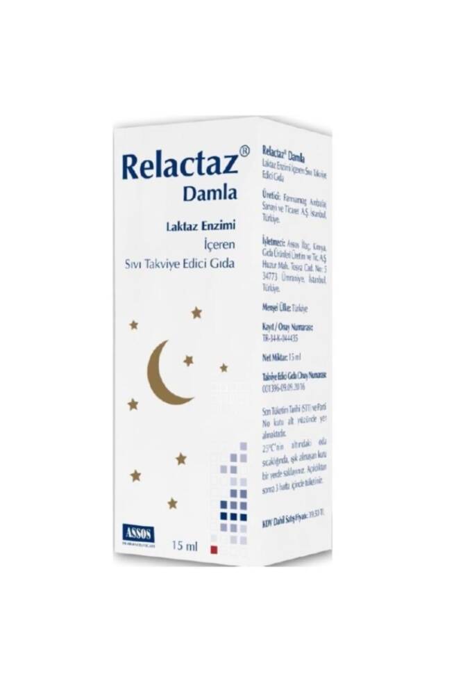 • Relactaz Laktaz Enzimi içeren Damla 15 ml Ürün Adı: Relactaz Laktaz Enzimi içeren Damla 15 ml Paket İçeriği: 15 ml Özet Bilgi: Takviye edici gıda. Kullanım Şekli: Her emzirme öncesinde 8 damla relactaz. Anne sütü ile besleniyorsa