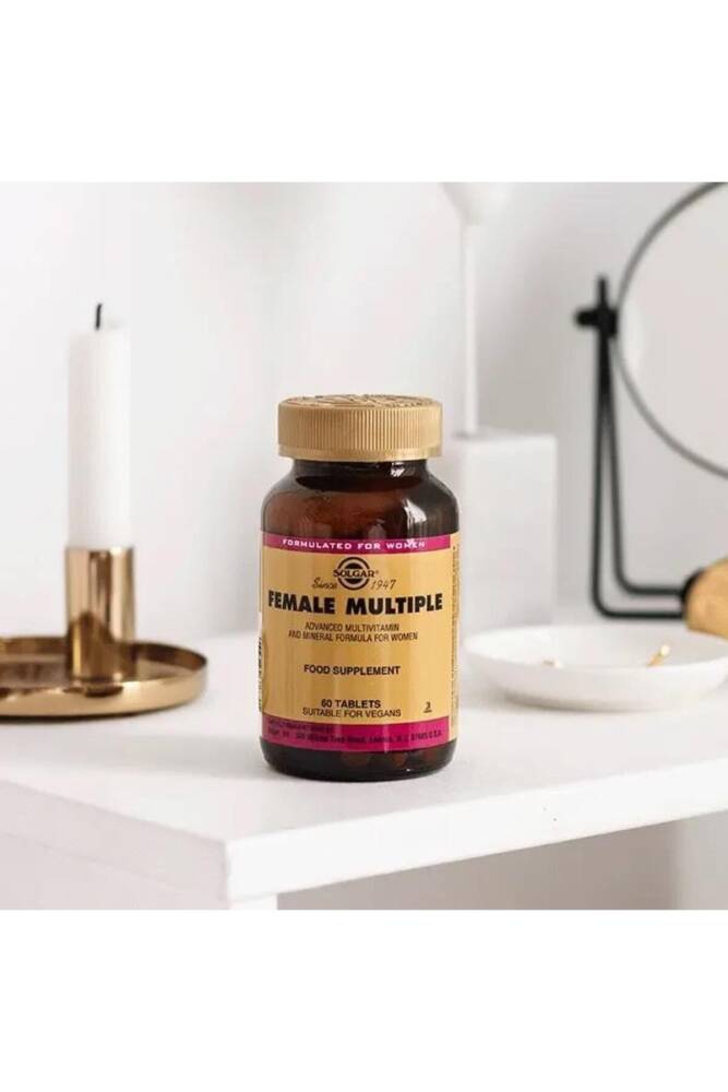 Solgar female multiple 60 tablet kadınlara özel multivitamin ve mineral desteğidir.“içeriğindeki, b2, b3, b5, b6 ve b12 vitamini yorgunluk ve bitkinliğin azalmasında rol oynar.”“selenyum ve çinko mineralleri, niasin, e ve c vitamini içerikleri ile normal saç, tırnak ve cildin korunmasına yardımcı olur.”“c vitamini kan damarlarının, kemiklerin, kıkırdağın, diş etlerinin, cildin ve dişlerin normal fonksiyonu için gerekli olan normal kollajen oluşumuna katkıda bulunur.”“d vitamini, kalsiyum ve magnezyum minerali normal kemiklerin korunmasını destekler.”* her tablette beta karoten 1,8 mg vitamin b1 (tiamin) (tiamin mononitrat) 16,7 mg vitamin b2 (riboflavin) (riboflavin 5'-Fosfat-Sodyum) 18 mg vitamin b3 (niasin) (nikotinamid) 20 mg ne vitamin b5 (pantotenik asit) (d-Pantotenat-Kalsiyum) 26,7 mg vitamin b6 (piridoksin) (piridoksin hidroklorür) 5 mg inositol 33,3 mg folik asit (pteroilmonoglutamik asit) 133,3 mcg vitamin b12 (kobalamin) (siyanokobalamin) 66,7 mcg vitamin c (l-Askorbik asit) 133,3 mg vitamin d2 (ergokalsiferol) (133,3 ıu) 3,3 mcg vitamin e (d-Alfa-Tokoferil asit süksinat) (45 ıu) 30 mg α-Te biotin (d-Biotin) 100 mcg vitamin k (fillokuinon) 20 mcg magnezyum (bisglisinat, oksit, sitrat) 133,3 mcg kalsiyum (bisglisinat, karbonat, sitrat) 133,3 mg kolin (kolin bitartarat) 33,3 mg demir (ferroz bisglisinat) 6 mg çinko (bisglisinat) 5 mg bakır (bisglisinat) 500 mcg manganez (bisglisinat) 0,7 mg iyot (potasyum iyodür) 50 mcg krom (pikolinat) 66,7 mcg selenyum (l-Selenometiyonin) 66,7 mcg turunçgil bioflavonoid kompleksi 8,3 mg hacim arttırıcılar (mikrokristalin selüloz, dikalsiyum fosfat), stabilizör (çapraz bağlı selüloz gam), topaklanmayı önleyiciler (silikon dioksit, yağ asitleri, yağ asitlerinin magnezyum tuzları), parlatıcılar (hidroksipropilmetil selüloz, gliserin), renklendiriciler (antosiyaninler, titanyum dioksit, karotenler), taşıyıcı (mannitol).