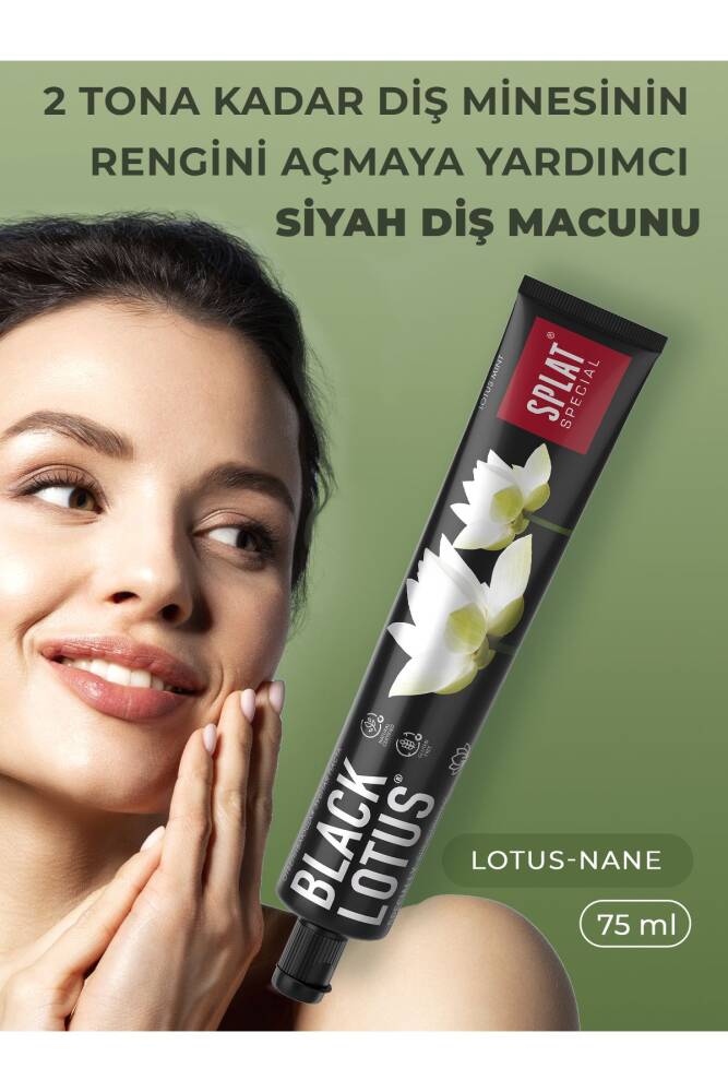 Lotus çiçeği özlü siyah diş macunu diş üzerinde oluşan lekeleri nazikçe temizlemeye, beyazlık sağlamaya yardımcı olur.