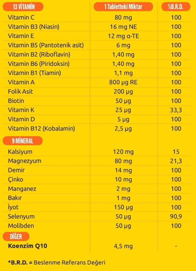 Yetişkinler için günde 1 tablet bir bardak su ile alınır. Uyarılar Tavsiye edilen günlük porsiyonu aşmayın. Takviye edici gıdalar normal beslenmenin yerine geçemez. Çocukların ulaşamayacağı yerde saklayın. İlaç değildir. Hastalıkların önlenmesi veya tedavi edilmesi amacıyla kullanılmaz. Hamilelik ve emzirme dönemi ile hastalık veya ilaç kullanılması durumlarında doktorunuza danışın. Ürünün içeriğindeki maddelerden herhangi birine karşı aşırı duyarlılığınız varsa kullanmayınız. Son Tüketim Tarihi (STT) ve Parti Numarası için kutunun altına bakınız. Özel muhafaza koşulları: 25 °C’nin altında ağzı sıkıca kapalı olarak saklayınız. Son tüketim tarihi uygun koşullarda salanmış ürün için geçerlidir.
