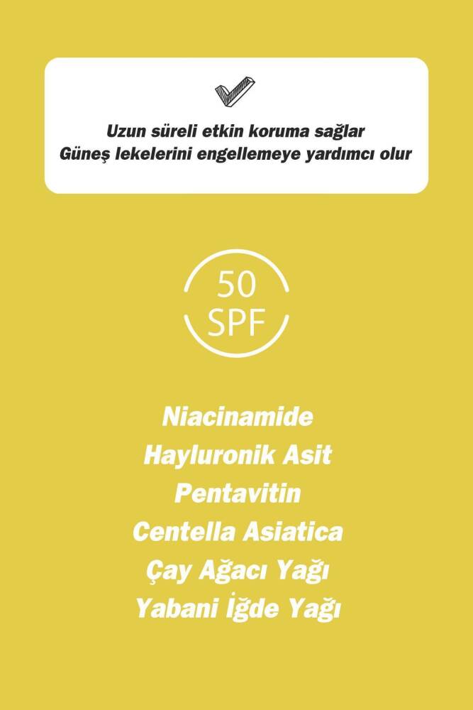 İçeriğinde Niacinamide, Hayluronik Asit, Pentavitin, Centella Asiatica Ekstraktı, Çay Ağacı Yağı ve Yabani İğde Yağı ile formüle edilmiş kozmetik bir üründür. İçeriğinde yer alan UV Filtreler ile cilt yaşlanmasının önemli sebeplerinden olan güneşin zararlı UVA ve UVB ışınlarına karşı cildinizi yüksek derecede korumaya yardımcı olur. Ayrıca; Pentavitin ve Hyaluronik Asit gibi ilave güçlü bileşenler sayesinde cildin ideal nem dengesini koruyarak cilt bariyerinin güçlenmesine katkı sağlar. Niacinamide ve Centella Asiatica Ekstraktı sayesinde, güneş kaynaklı leke oluşumunu önleyerek cilt tonunu eşitlemeye yardımcı olurken içerdiği bitkisel kaynaklı bileşenlerin antioksidan özellikleri ile cildi dış etkenlere karşı korumaya katkı sağlar. Günlük kullanıma uygun bir Güneş Koruyucu Kremdir.