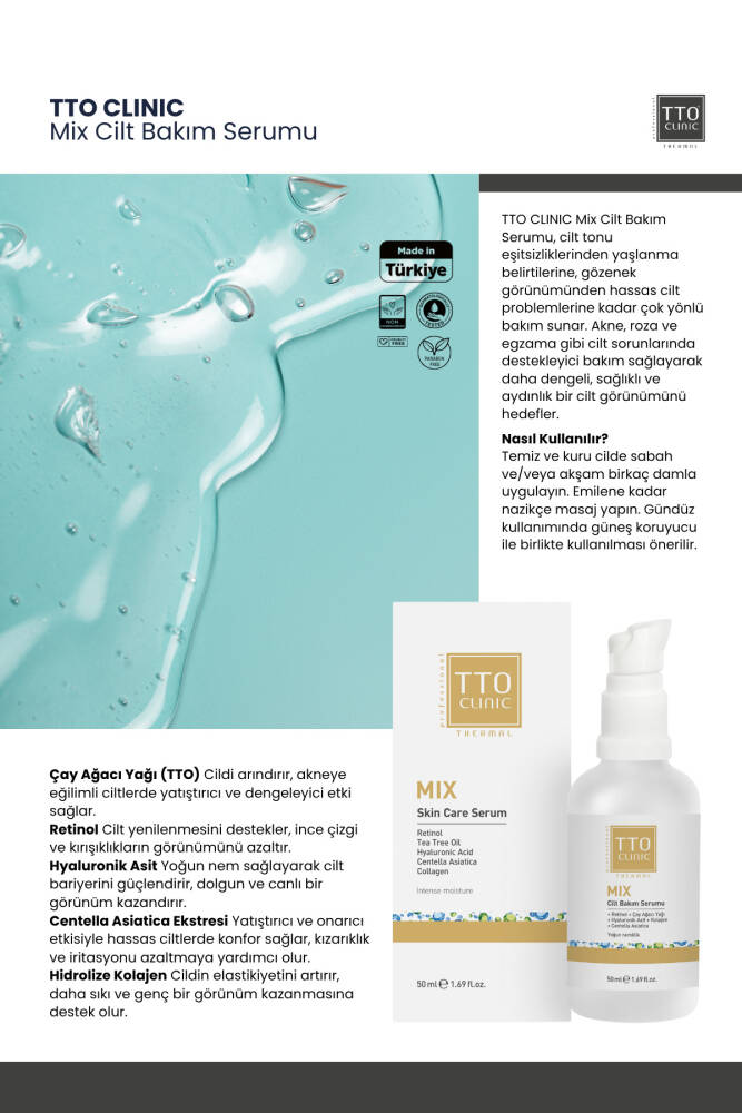 TTO CLINIC MIX CİLT BAKIM SERUMU içeriğinde yer alan temel bileşenler (Retinol, Kolajen, Hyaluronik Asit, Centella Asiatica Ekstraktı ve Çay Ağacı Yağı) ile özel formüle edilmiştir.