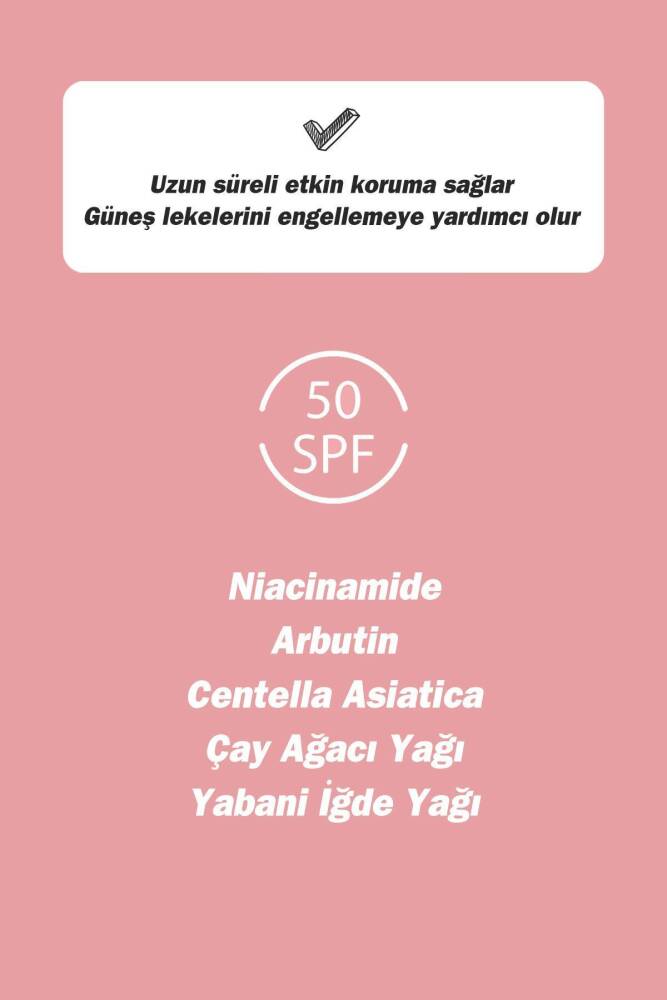 İçeriğindeki UV filtreler ile cildinizi güneşten gelen UVA ve UVB ışınlarının zararlı etkilerinden korumanıza yardımcı olurken, hafif rengiyle eşit bir cilt tonu edinmenize katkı sağlar. Niacinamide, Arbutin, Centella Asiatica Ekstraktı, Çay Ağacı Yağı ve Yabani İğde Yağı ile formüle edilmiş kozmetik bir üründür. İçeriğinde bulunan Niacinamide ve Arbutin cilt bariyerine destek olurken leke oluşumunu önleyerek cilt tonunu eşitlemeye yardımcı olur. Centella Asiatica Ekstraktı ile cildinizi kuruluğa karşı koruyarak, Çay ağacı Yağı ve Yabani İğde Yağı antioksidan özellikleri ile cildi dış etkenlere karşı korur. Günlük kullanım için uygundur.