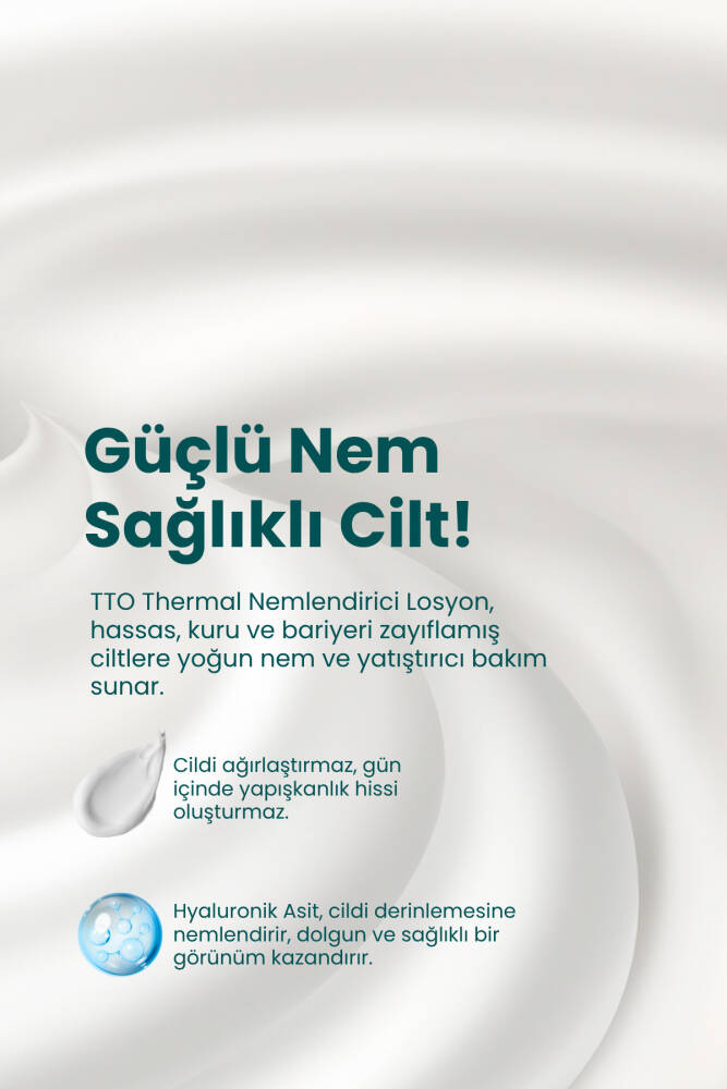 • Açıklama: Tüm cilt tiplerine uygun olarak üretilen TTO Nemlendirici Losyon, içeriğinde bulunan Tea Tree Oil (Çay Ağacı Yağı), Çinko Oksit, Papatya Yağı, Yabani İğde Yağı, Sarı Kantaron Yağı, E Vitamini ve Shea Yağı ile cildi nemlendirirken, pürüzsüz bir görünüm sağlamaya yardımcı günlük bakım ürünüdür.