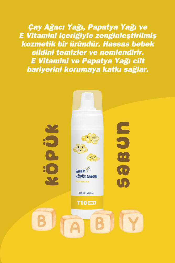 • TTO SOFT BABY KÖPÜK SABUN 200 ML Çay Ağacı Yağı, Papatya Yağı ve E Vitamini içeriğiyle zenginleştirilmiş bir kozmetik üründür.