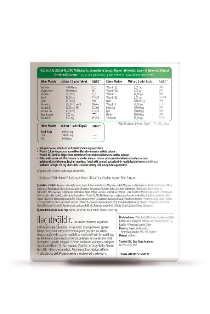 breast-feeding, doğum sonrası besin rezervlerine destek olmak için formüle edilmiştir1. breast-feeding kutusundan emzirme döneminde hem anneye hem de bebeğe beslenme rezervi konusunda destek olmak üzere iki farklı blister çıkmaktadır. breast-feeding vitamin, mineral, ve Omega-3 içeren takviye edici gıdadır1. breast-feeding içerisinden çıkan blisterlerin biri vitamin, mineral ve özel besinler içerirken diğer blisterler Omega-3 kapsülleri içerir. breast-feeding’in içeriğindeki Dokozahekzaenoik asit (DHA)’nın anne tarafından alınması fetusun ve emzirilen bebeklerin normal göz ve beyin gelişimine katkıda bulunur. Emziren kadınlarda faydalı etki, omega-3 yağ asitlerinin yetişkinler için önerilen günlük alım miktarına (örneğin 250 mg DHA ve EPA) ek olarak 200 mg DHA alındığında sağlanacaktır1.breast-feeding emzirme dönemi boyunca alınabilir1. Önerilen Kullanım 11 yaş ve üzeri yetişkinlerde, günde 2 tablet ve 1 kapsül alınması tavsiye edilir. Koruyucu içermez Vejetaryenler için uygundur Gluten içermez Maya veya laktoz içermez Pregnacare®breast-feeding hayvanlarda test edilmemiştir